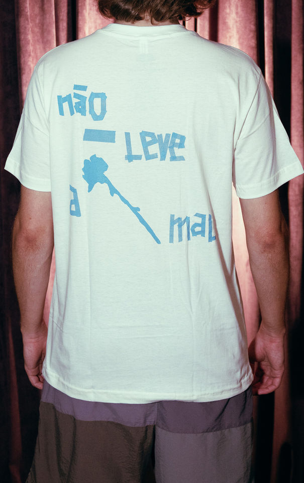 Camiseta do álbum Não Leve a Mal, primeiro álbum de estúdio da PLUMA, manga curta, nas versões preta e branca, com estampa na frente e atrás, artes por Maria Cau Levy